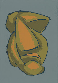 Im Anschluß daran wurde der Holzschnittzyklus fertig gestellt. Die Farbigkeit und die Volumenbildung wurde von den Bildern übernommen und vereinfacht in den Entwürfen zu den Holzschnitten eingearbeitet. Er entstand im Verfahren des "Verlorenen Schnittes". D.h. das ich diese Motive später nicht mehr nachdrucken kann. So können auch Fehler, oder Farbabstufungen nicht mehr durch einen Neudruck verbessert werden. Der Vorteil ist die hohe Passgenauigkeit, die ich insbesondere für die Sichbarkeit der Linien benötigte.